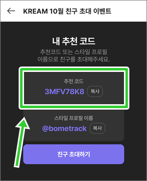 카테고리 없음 크림 추천코드 3MFV78K8 and 본인 코드 확인하는 법 by hello_made 2024. 10. 5. 크림 추천코드 (KREAM Invite code) 3MFV78K8 크림 자신 코드와 스타일 프로필 이름 간편하게 확인하는 법 크림 앱에서 우측 하단 [MY] 클릭 가운데 [친구 초대] 클릭. 화면 아래로 스크롤. 본인의 추천코드와 스타일 프로필 이름 확인. 크림 앱에서 코드를 찾는 루트를 알려주는 이미지. 본인의 추천코드와 스타일 프로필 이름이 보인다. 공유하기 게시글 관리 hello.complexcon.net