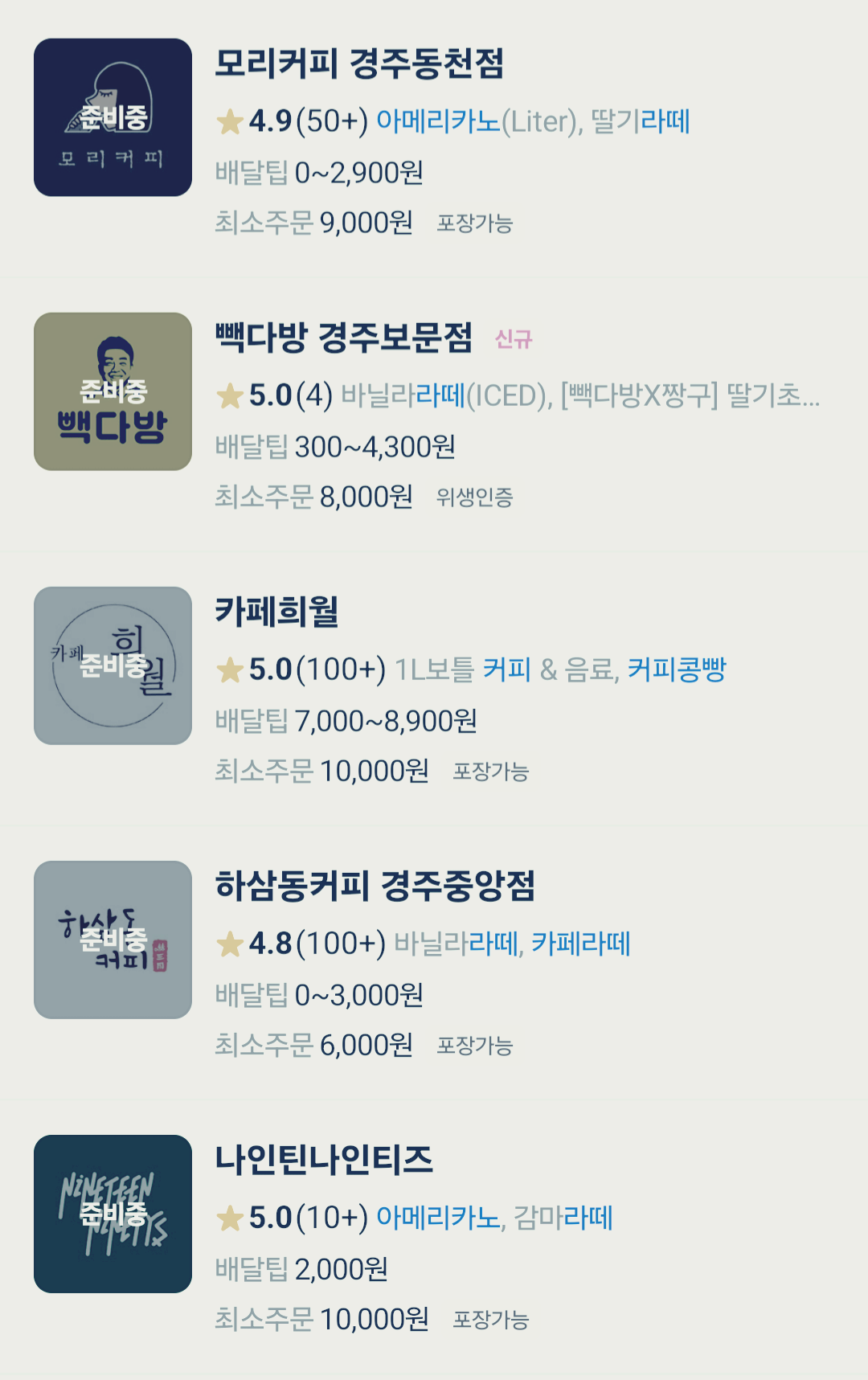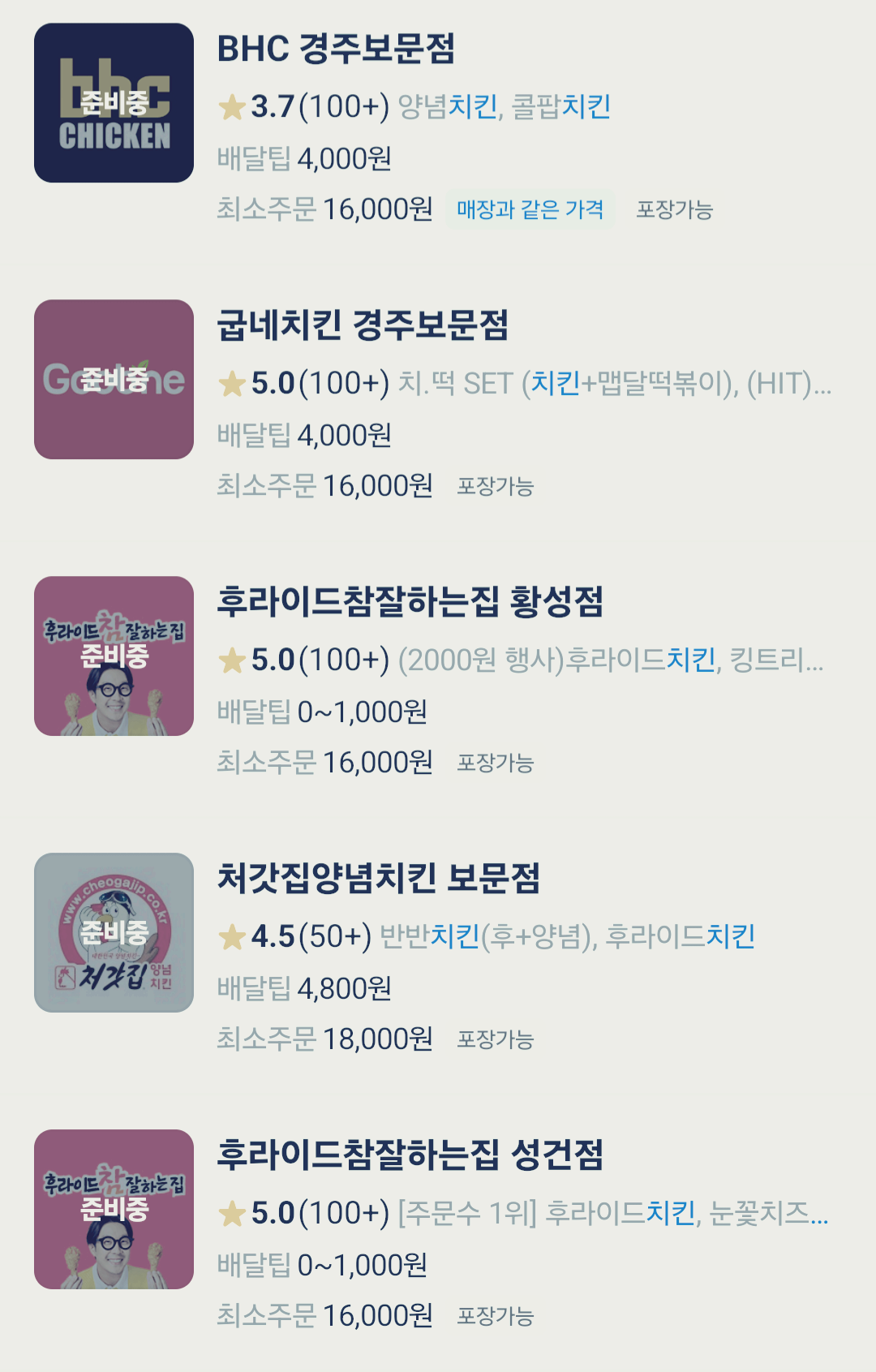 글을 작성하는 시간이 새벽이라 배달 매장들이 대다수 준비 중으로 나오는 점 참고해 주세요.